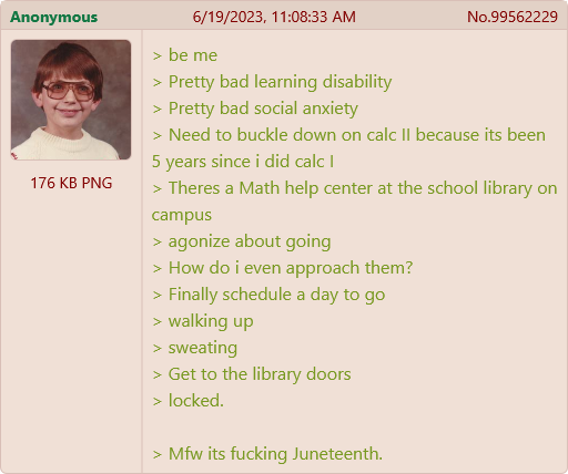 arrow-up11arrow-down1imageJuneteenthlemmy.mlStarvingMartist@sh.itjust.works to > Greentext@lemmy.mlEnglish · 4 months agomessage-square0fedilink