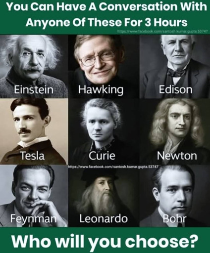 Anyway Marie Curie would be at least as interesting to talk to as any of them, just maybe bring personal dosimeter for peace of mind.