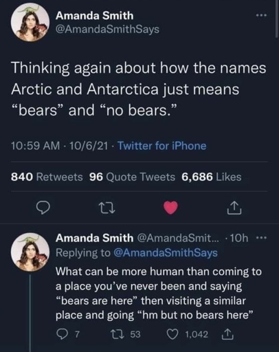 the truth is less fun, but i guess you could still view arctic as “bear place” and antarctica as “not the bear place” and that’s still kinda funny i think