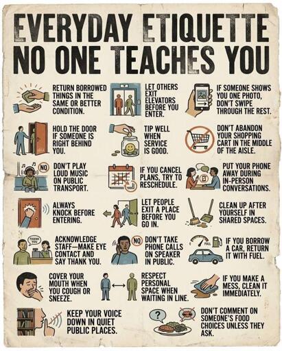 My suspicion is that somebody created a list of things they thought was the epitome of wisdom in general social interactions, in the US and not in a city with public transport options. They possibly used so-called AI to compile this list. It’s even more likely that they used it to design the poster and to draw the little pictures. And then posted it online to be praised for their effort (don’t aura farm ought to be a bullet point on this poster as well). It deserves to be criticized.