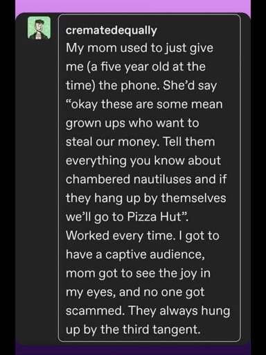 "you work for [insert company they’re pretending to be from]? Is that what you tell your mother?