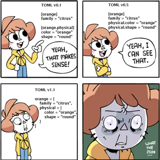 I don’t feel like it will stray very far from what’s dubbed “TOML 0.1” in the meme. Yes, it has inline tables and as of TOML 1.1, they’re allowed to span multiple lines, so it’s technically not anymore illegal to do what’s in the meme. But all things considered, this is still a miniscule change compared to TOML 1.0.
