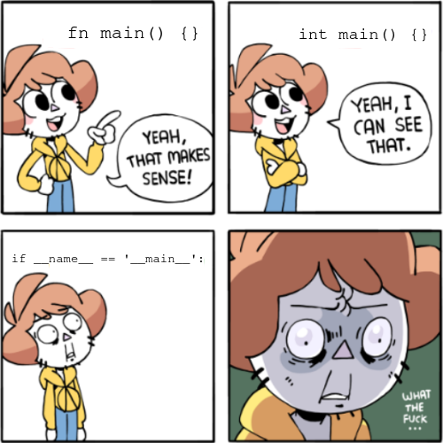 I feel that Python is a bit of a ‘Microsoft Word’ of languages. Your own scripts are obviously completely fine, using a sensible and pragmatic selection of the language features in a robust fashion, but everyone else’s are absurd collections of hacks that fall to pieces at the first modification.